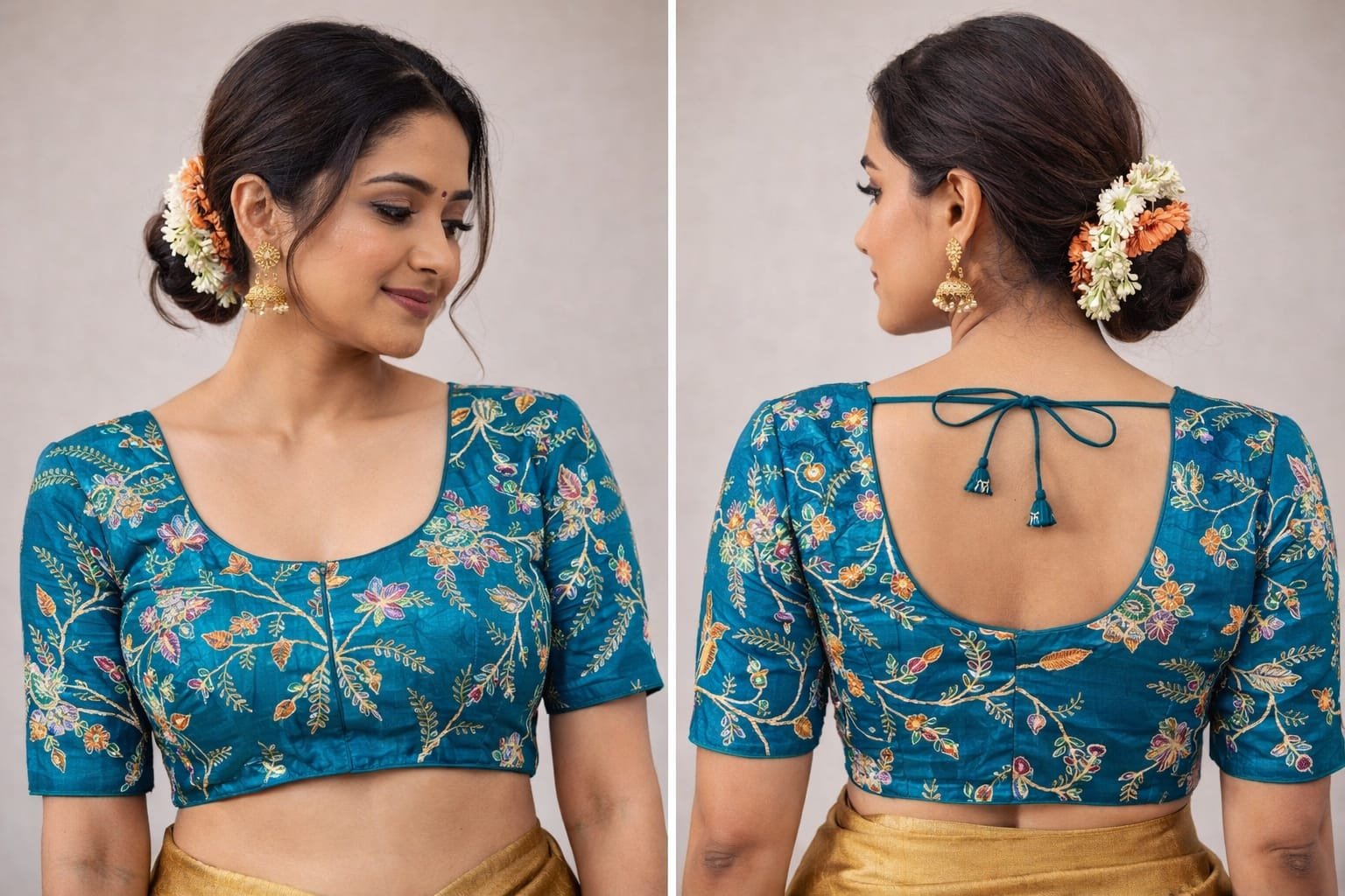 Enhance your traditional wardrobe with this stunning blue colored spacesilk blouse, beautifully adorned with intricate sequins and gold zari embroidery in a delicate floral pattern. Designed with a princess cut, this blouse offers a timeless and elegant look. It comes sleeveless but includes optional short sleeves for added versatility. The comfortable fit with front open, accommodating sizes 32 to 38, makes it an excellent choice for various occasions. Perfect for pairing with sarees or lehengas, this blouse adds a touch of glamour and sophistication to your festive or celebratory ensemble.